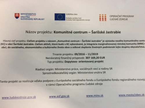 Cieľom projektu s názvom „Komunitné centrum – Šarišské Jastrabie“ je výstavba nového komunitného centra (KC) v obci Šarišské Jastrabie. Cieľom aktivít, ktoré budú v KC vykonávané, je integrácia marginalizovanej rómskej komunity (MRK) v obci, do sociálneho, ekonomického a kultúrneho života obce a celkové zlepšenie životných podmienok tejto skupiny obyvateľstva.