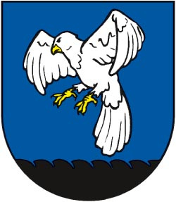 V modrom poli štítu biely /strieborný/ jastrab, so žltou /zlatou/ zbrojou letiaci nad zelenou oráčinou.